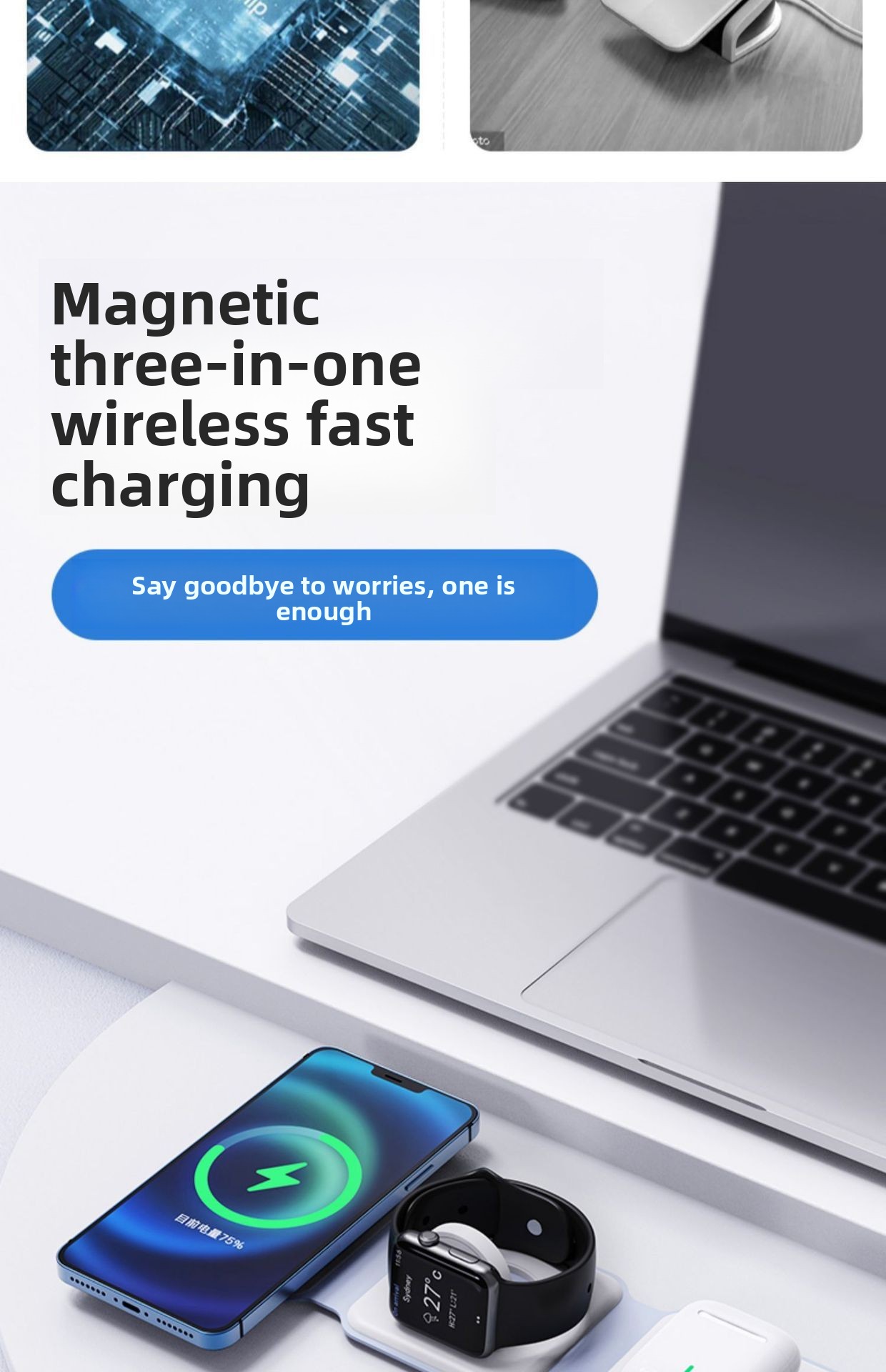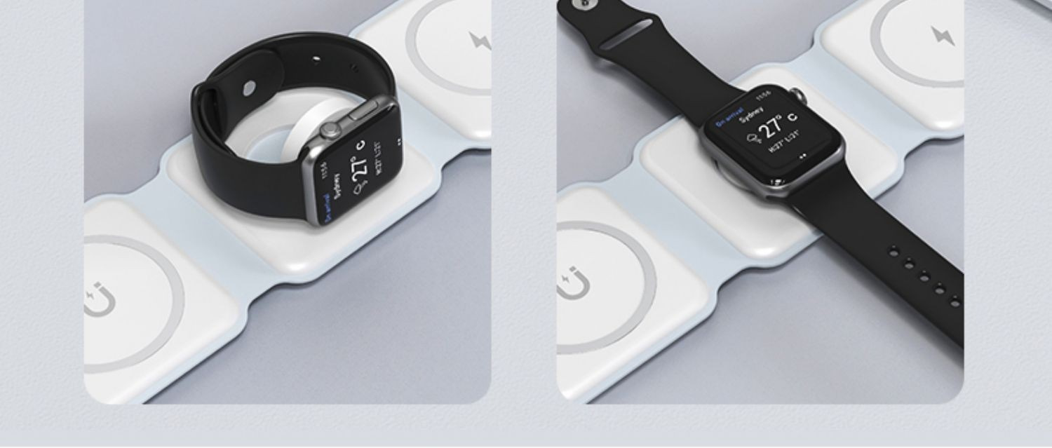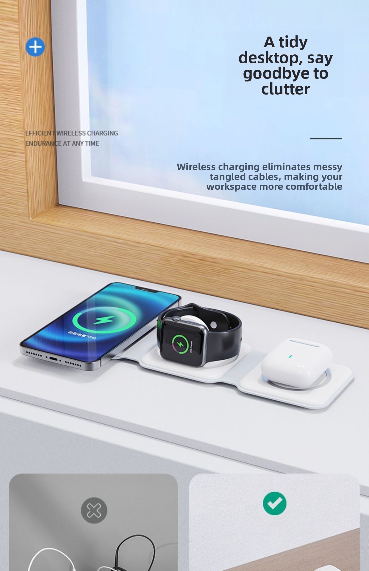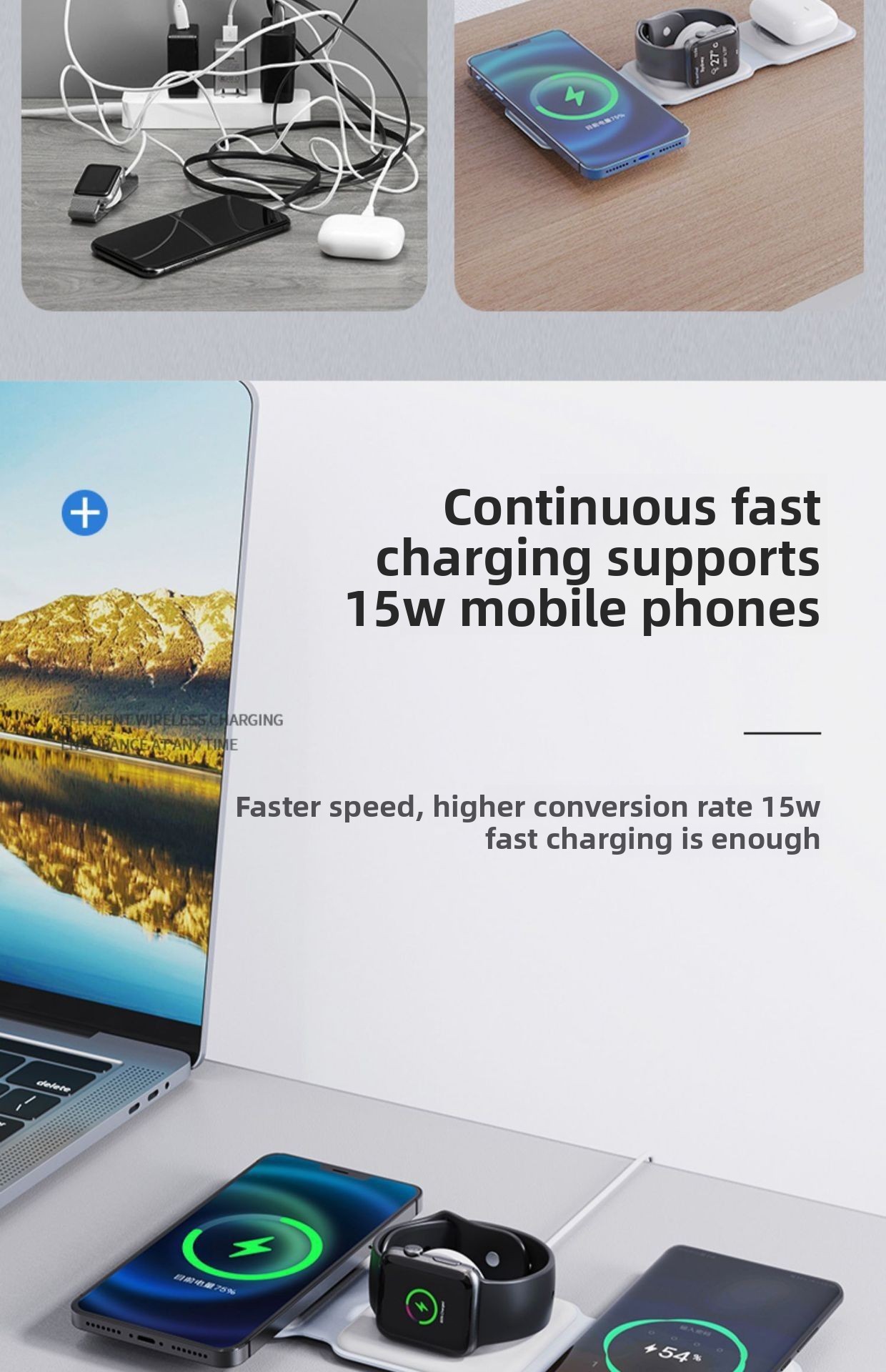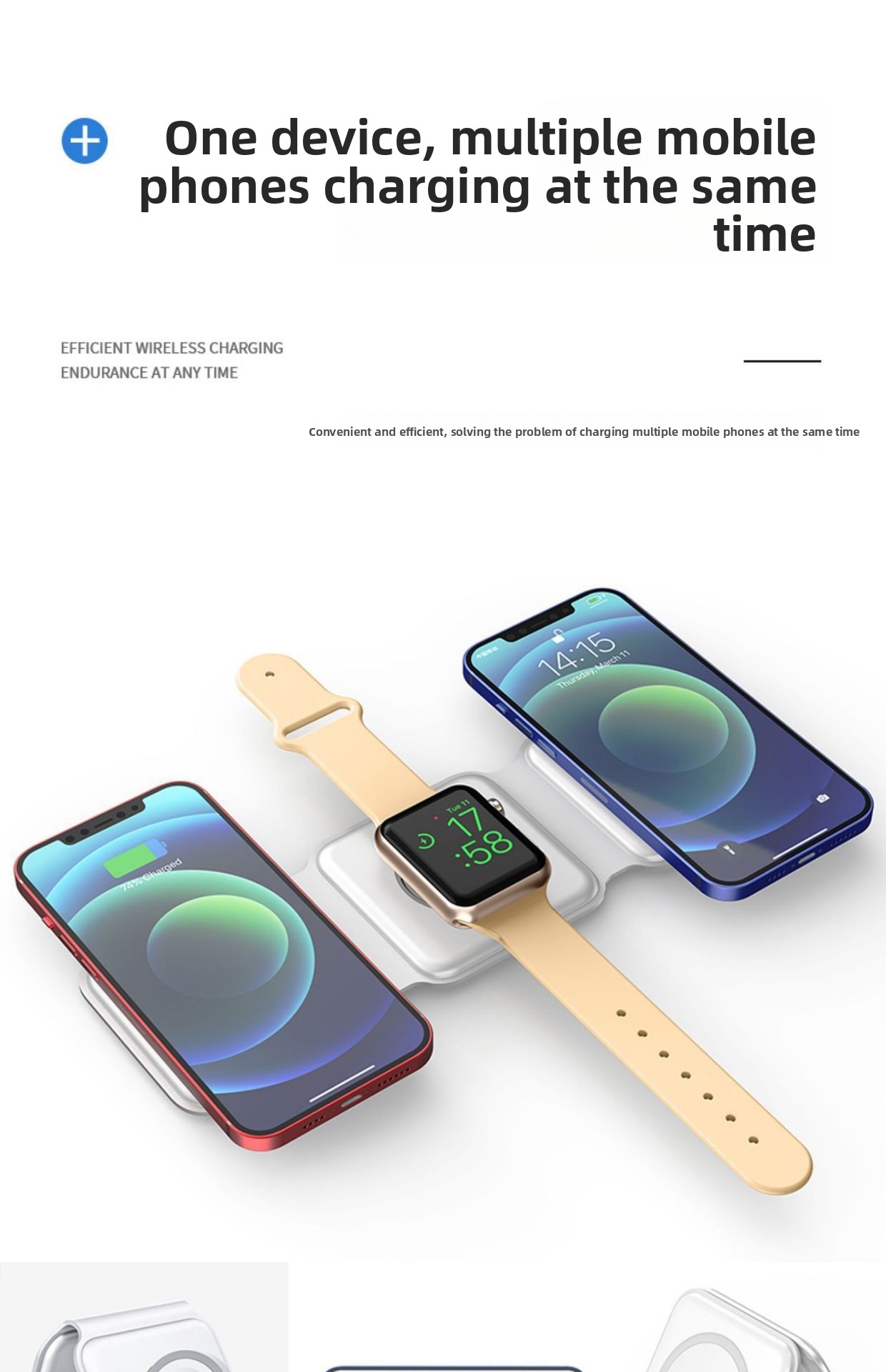 Three-in-One Function - Simultaneously charges phone, watch, and earbuds